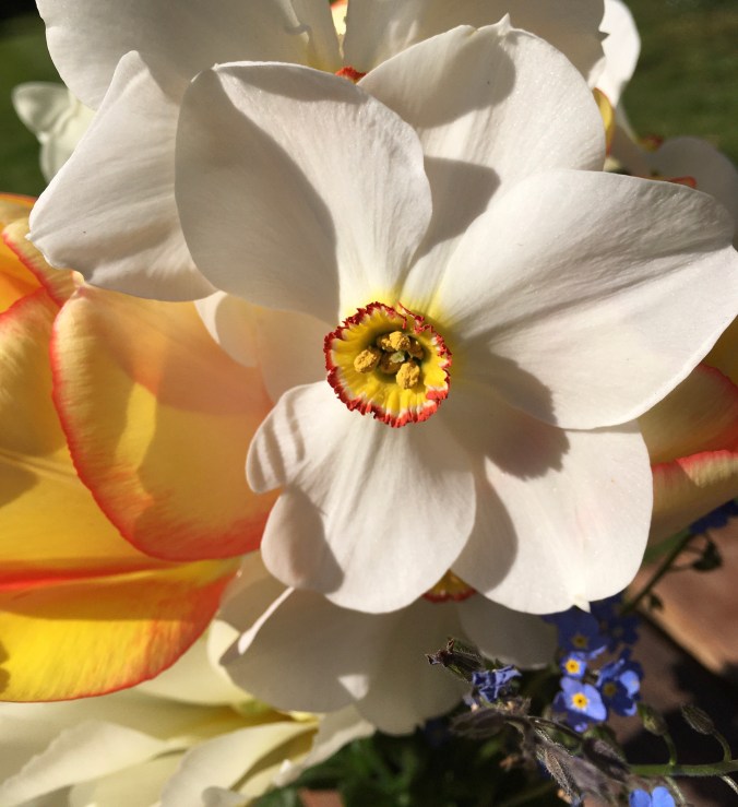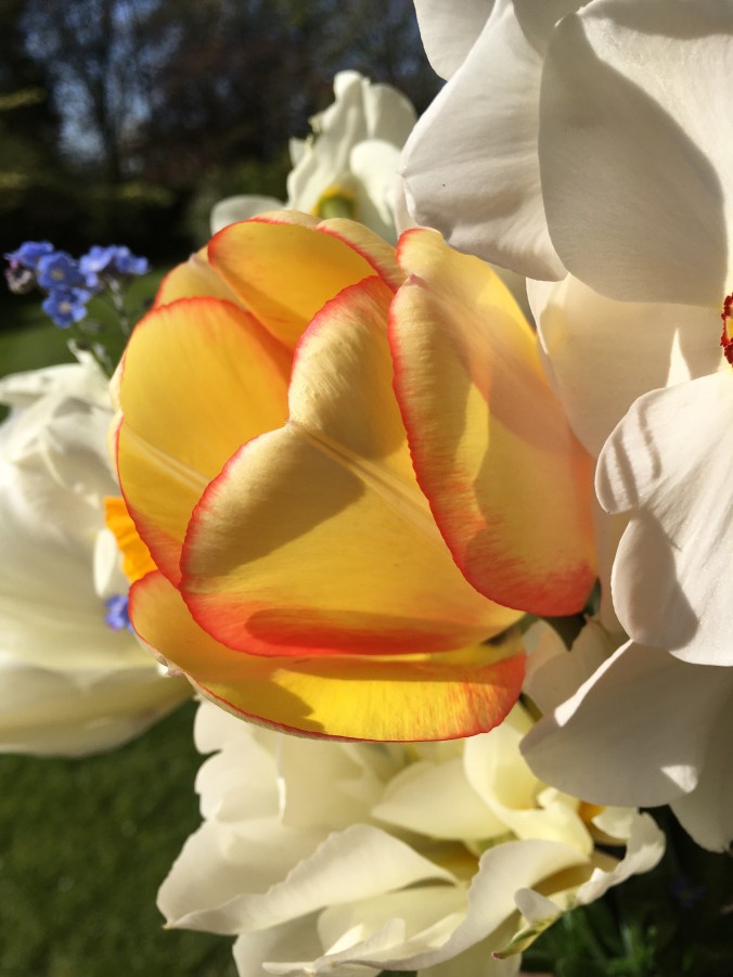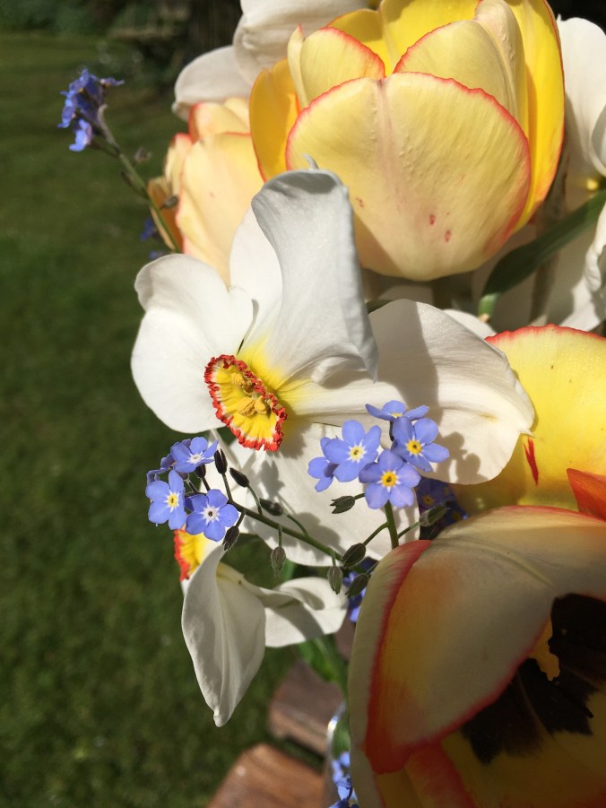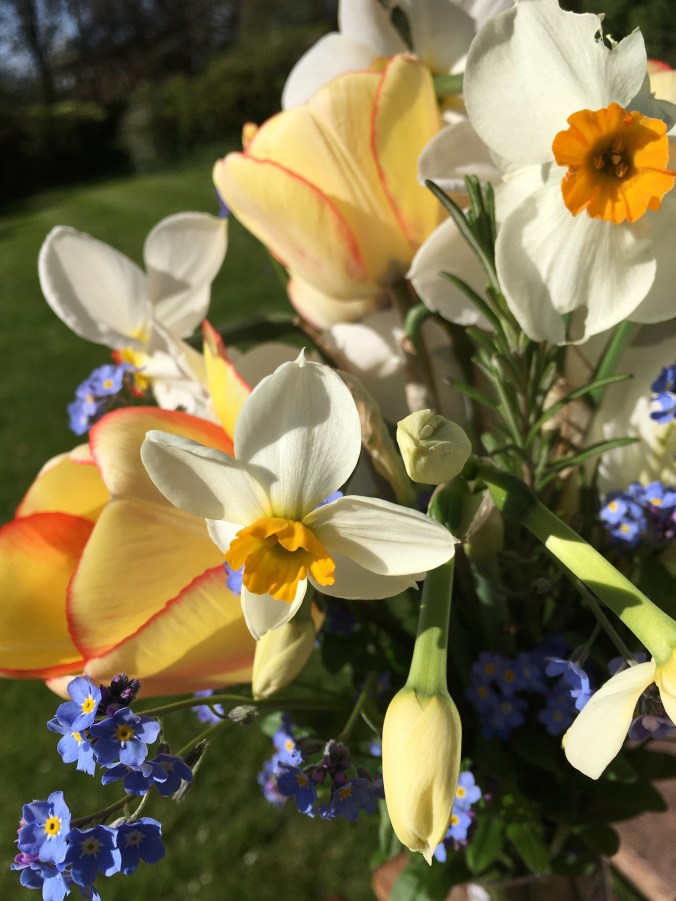 My cut flower tulips are in bud. Tulips in the sunny front garden are already flowering early. I’ll cut a huge bunch of daffodils and tulips for the front windows. Vases of flowers will cheer up anyone passing by, even though they can’t call in to visit.