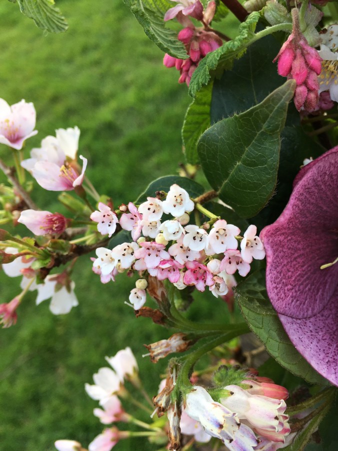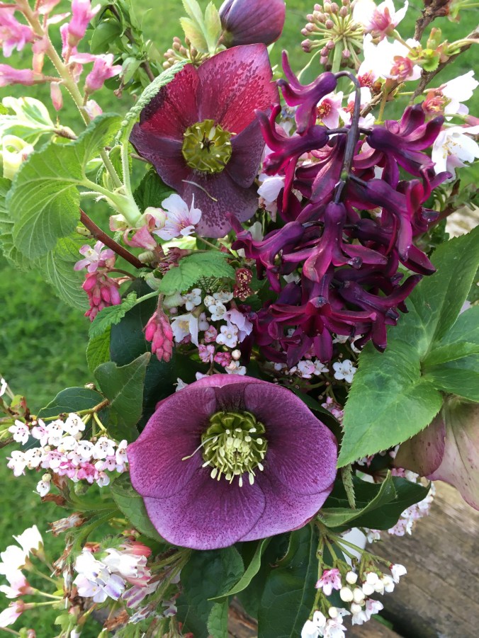 Dark, plum-toned Hellebore Rachel, with ruby hyacinth Woodstock, surrounded by Prunus Kojo-no-mai, ribes, Viburnum Eve Price, and pink comfrey.
