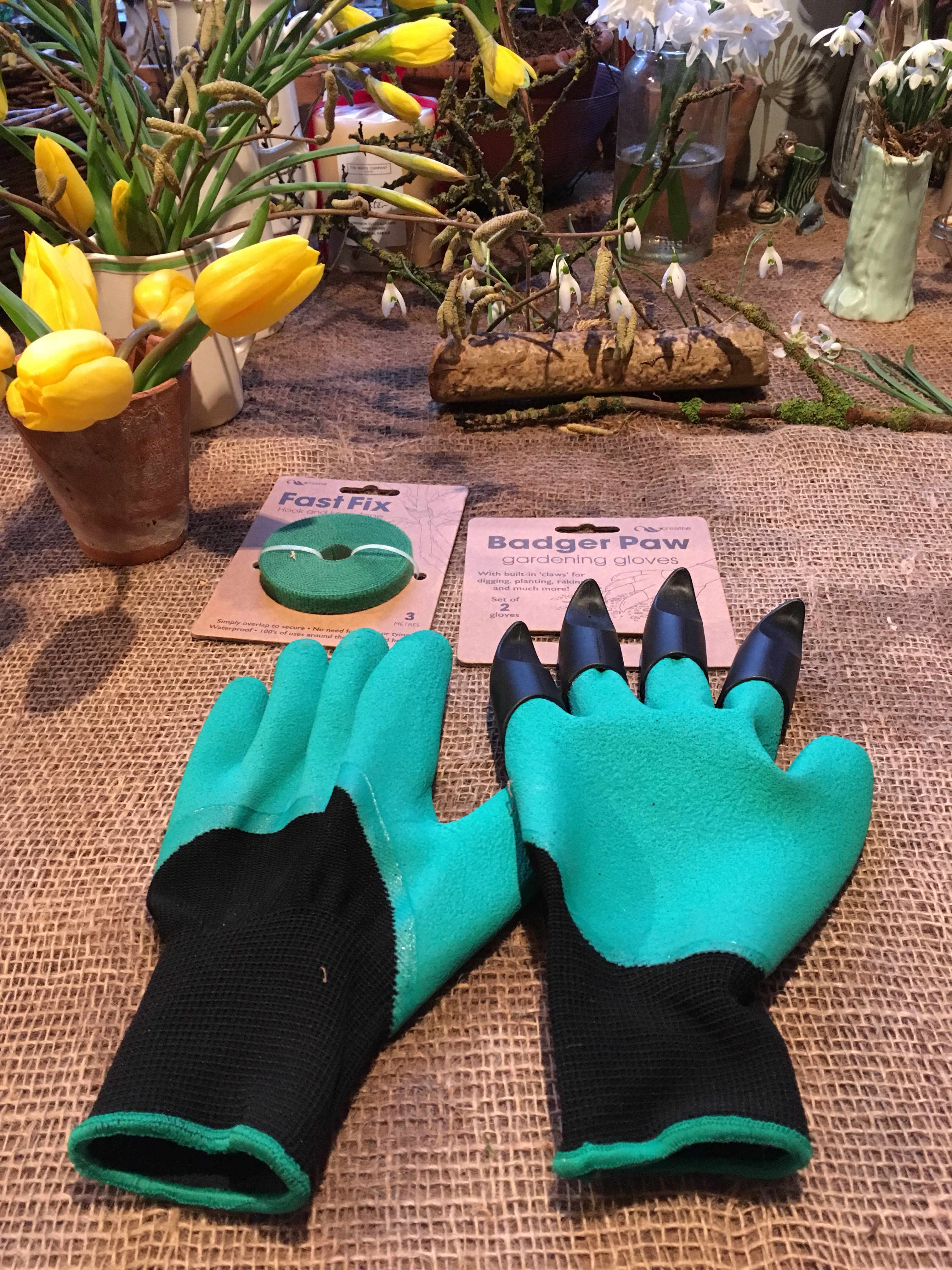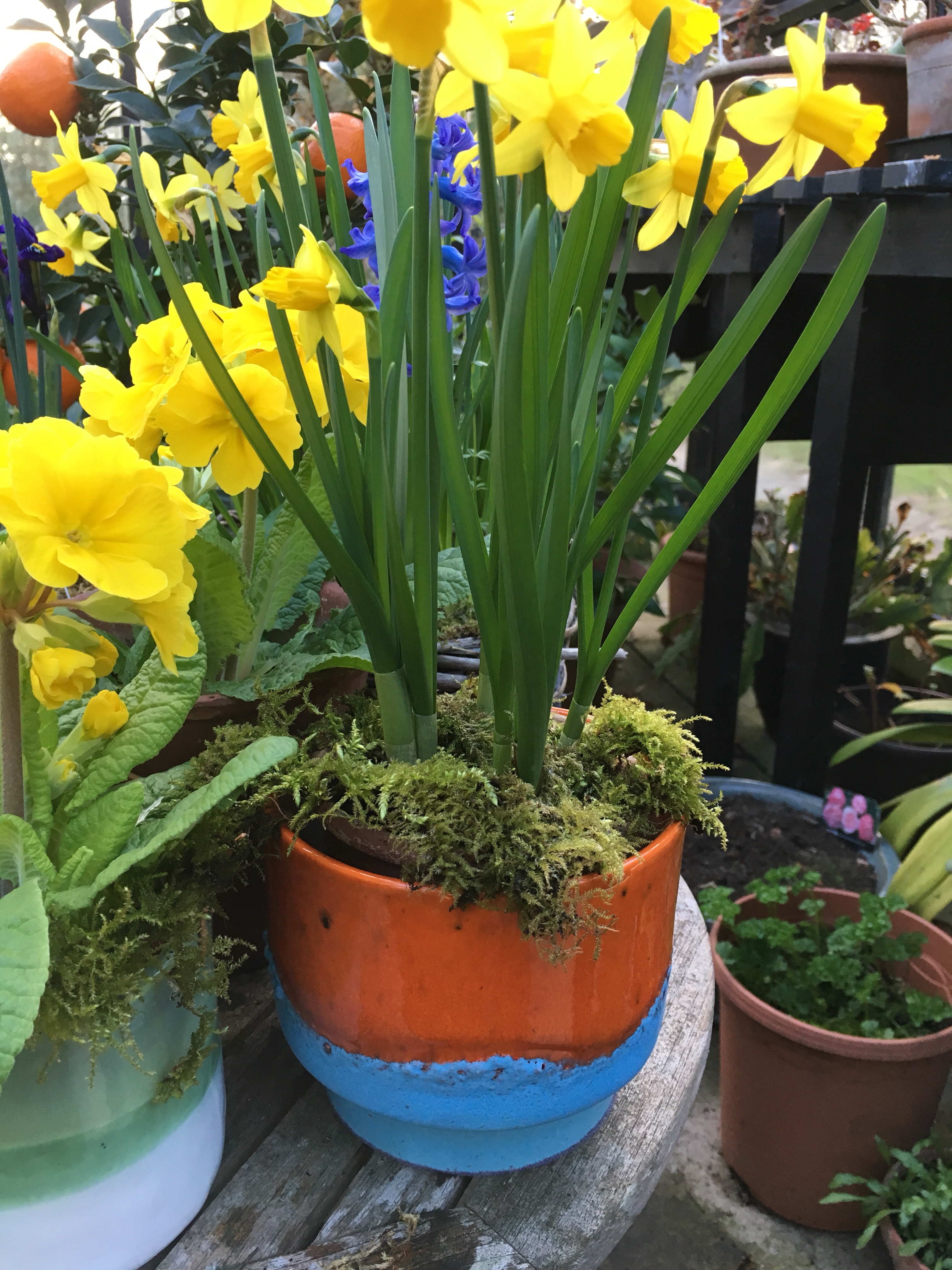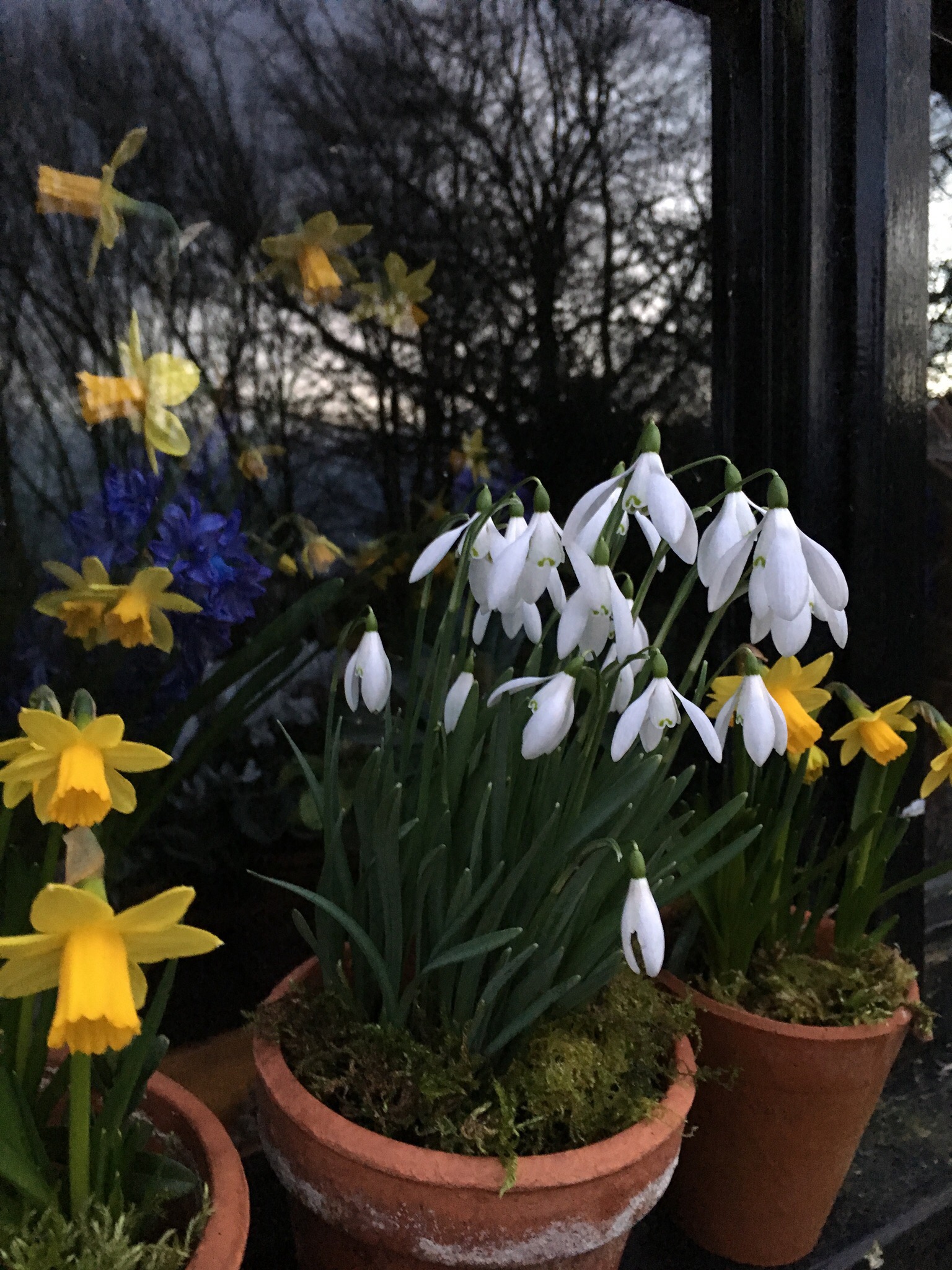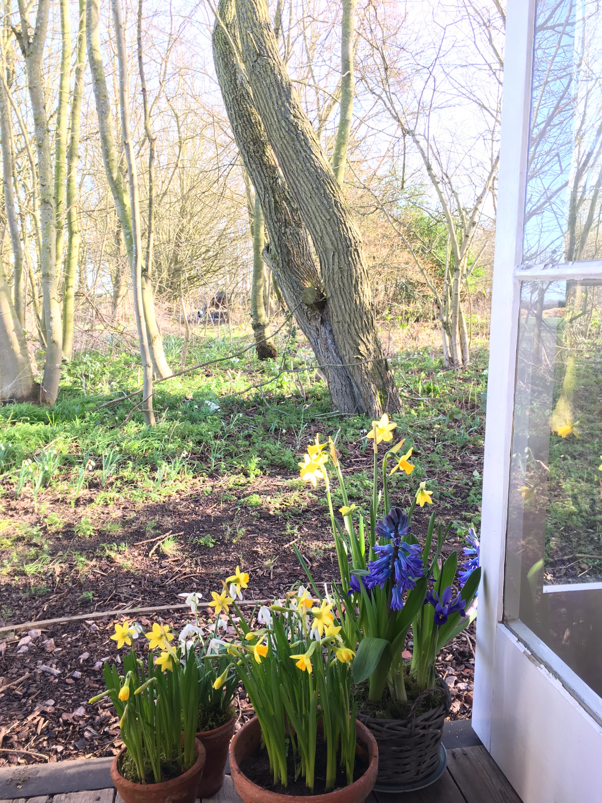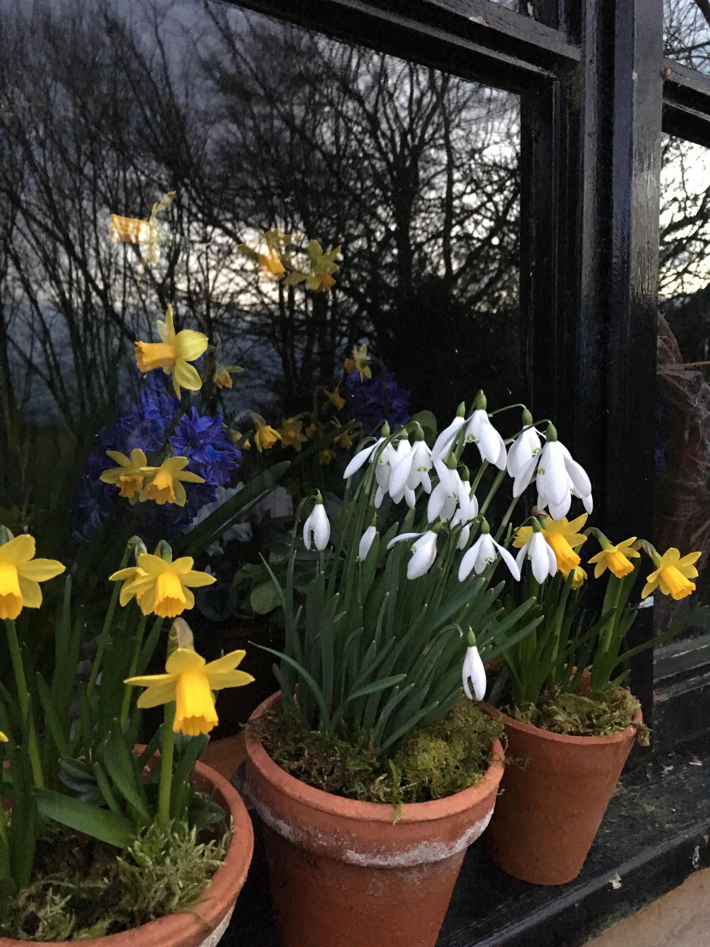 And finally, the pottingshed windowsill has pots of tiny tete a tete daffodils and single snowdrops. You can just see the blue hyacinths and matching daffodils inside the shed where the scent is intoxicating- mixed with smells of petrol for the mower and compost on the potting bench!
