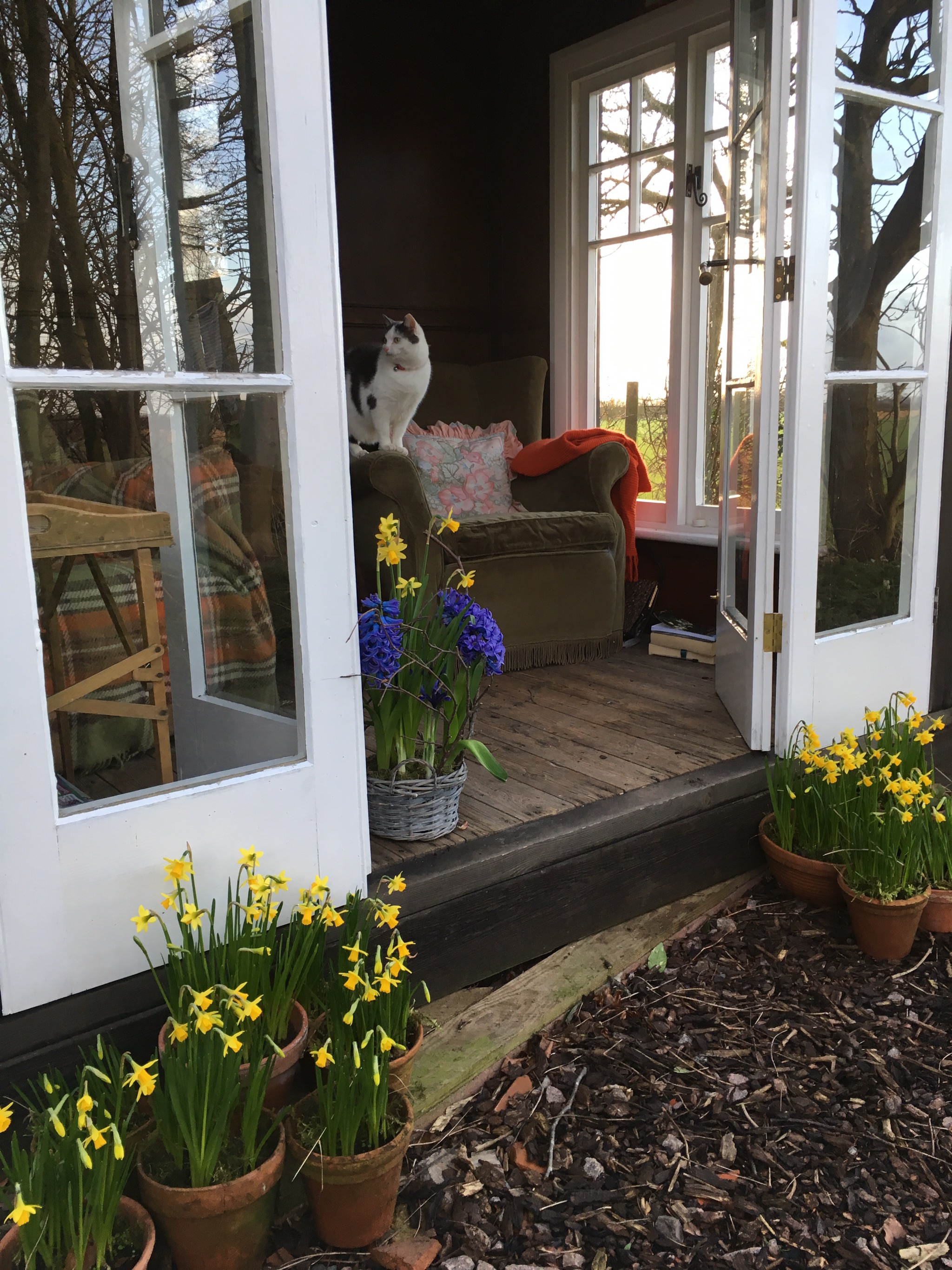 It’s been sunny and warm enough on a couple of days to open the summerhouse doors. Grace cat has appreciated the warm weather. I’ve propped up the blue hyacinths with hazel twigs. Catkins are a perfect match for spring bulbs. Tete a tete daffodils were planted in pots in October and put behind the pottingshed out of sight. Luckily I looked the other day, and they were in full flower. A week or two earlier than last year.