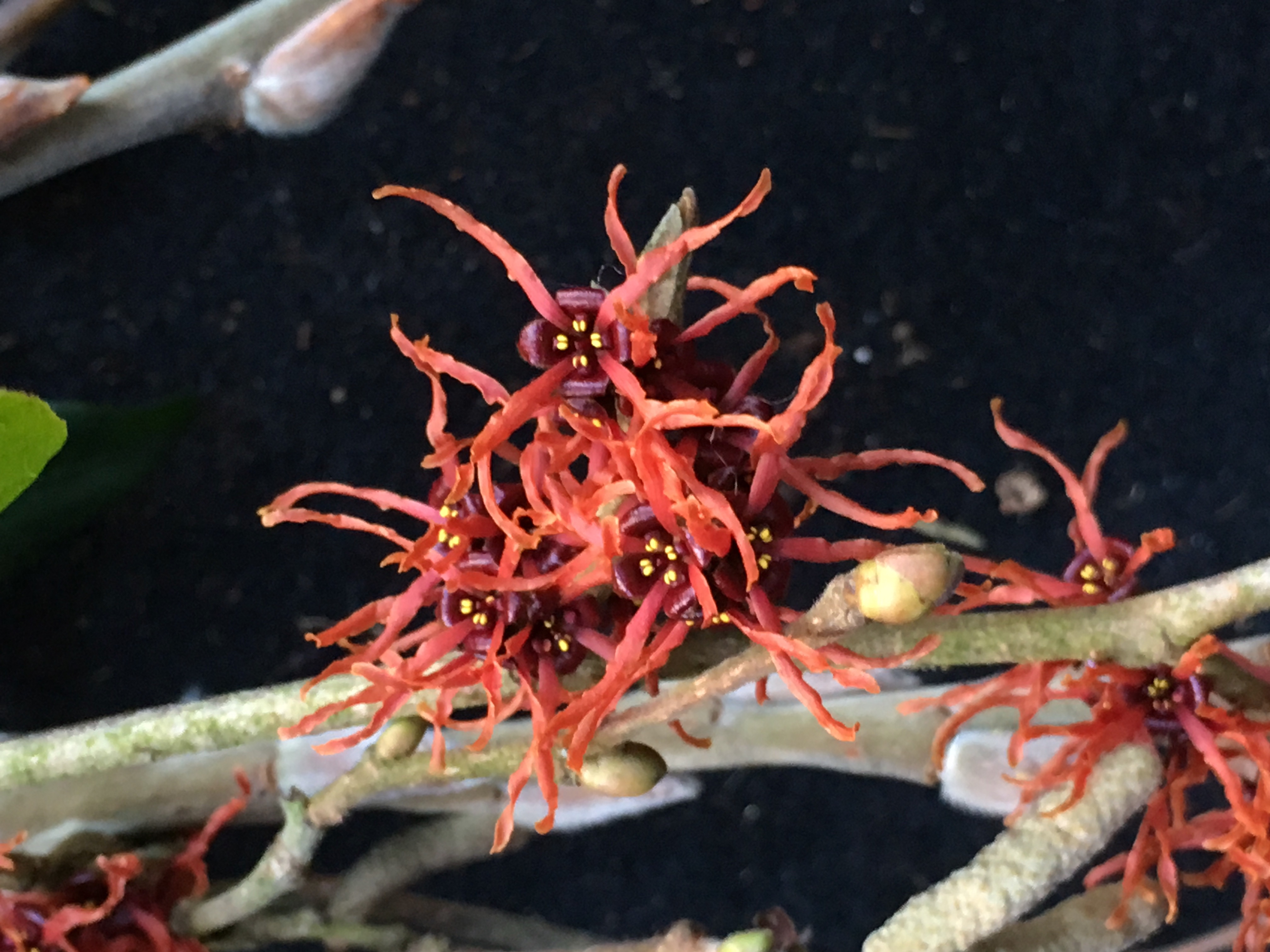 The sugar pink flowers are Viburnum Dawn. In the centre there’s Hamamelis Jelena, and on the right, winter flowering honeysuckle, Lonicera purpusii. There’s also some daphne and to add more cheer, pussy willow catkins and hazel or corylus “lambs tails.” The Hamamelis was a bargain basement purchase for just a few pounds, but didn’t have any labels. Cathy – who hosts the IAVOM meme – writes about Hamamelis this week and I learned that Jelena is named after Mrs Jelena De Belder, and Diane is named after her daughter. You can read all about Cathy’s Hamamelis collection Here .