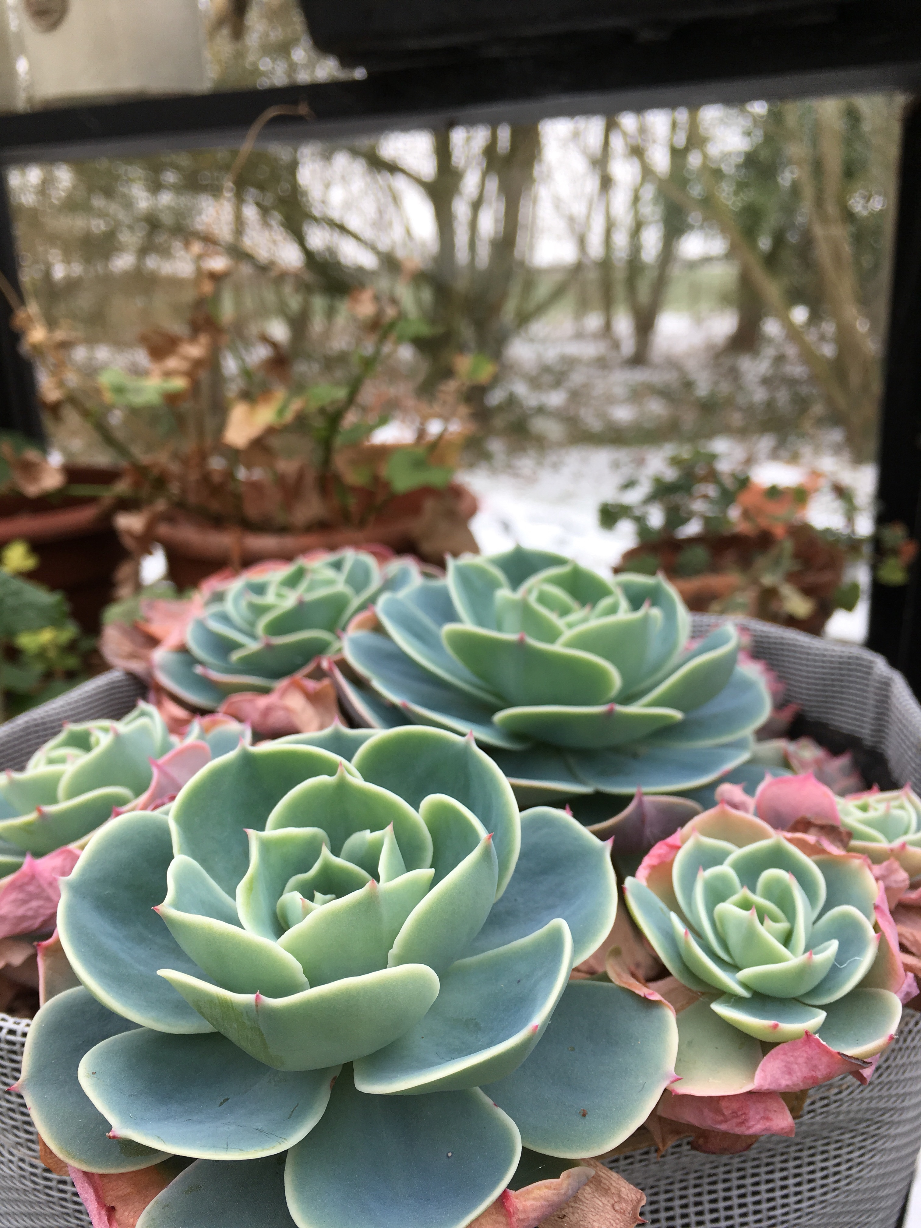 And on the pottingshed window to welcome me home- there’s a pot of snowdrops I bought at Hodsock last year. They are just the common Galanthus Nivalis. But I like them just as much as all the fancy named varieties. They suit the humble setting.