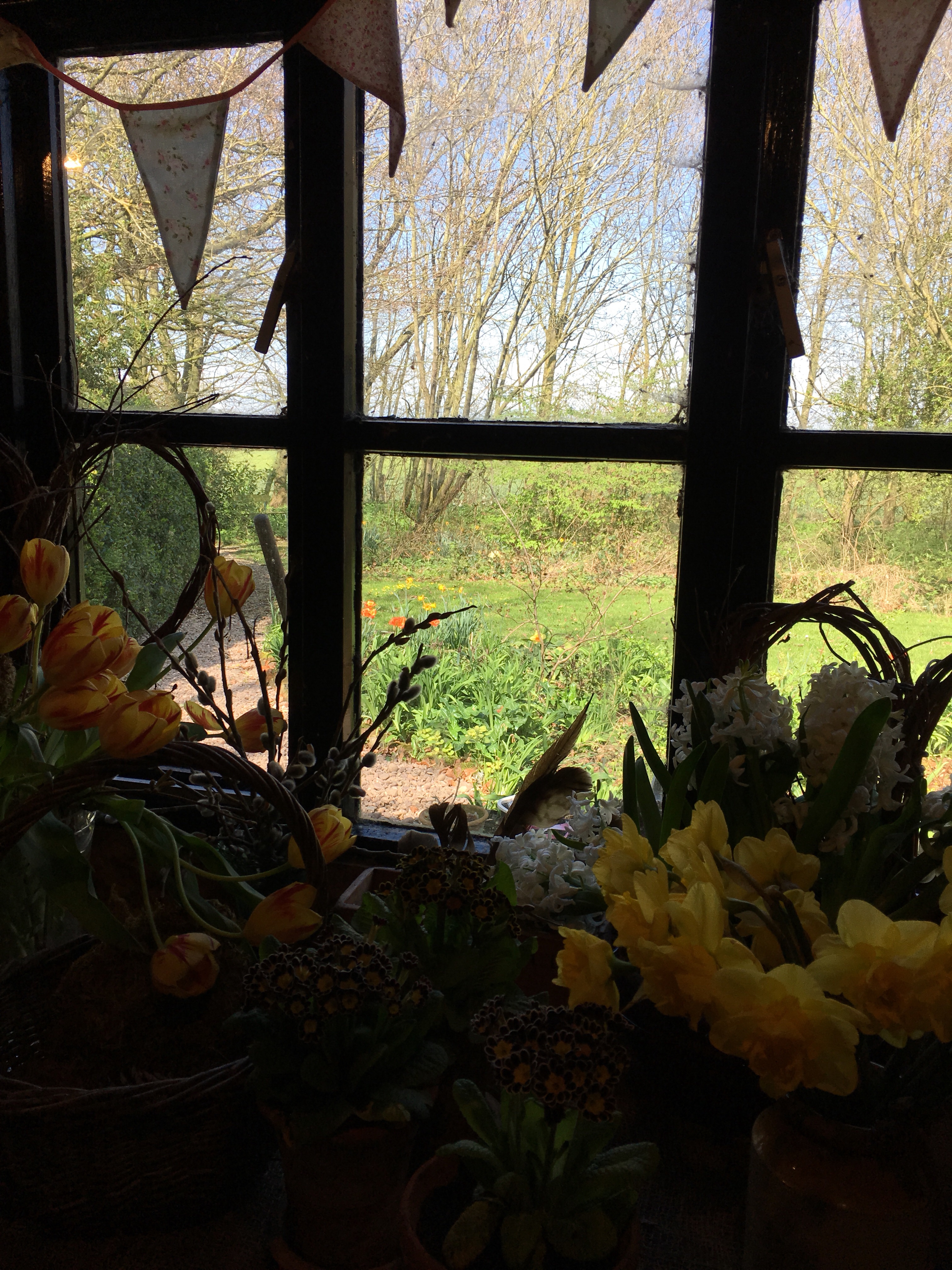 I love these cheerful jonquils on the potting shed windowsill. A perfect match for forget-me-nots, and just the right size for jam jar flowers. Trees by the pond show a reflection in the window. And the last of the paperwhites, hyacinths and cyclemen are pressing at the glass.
