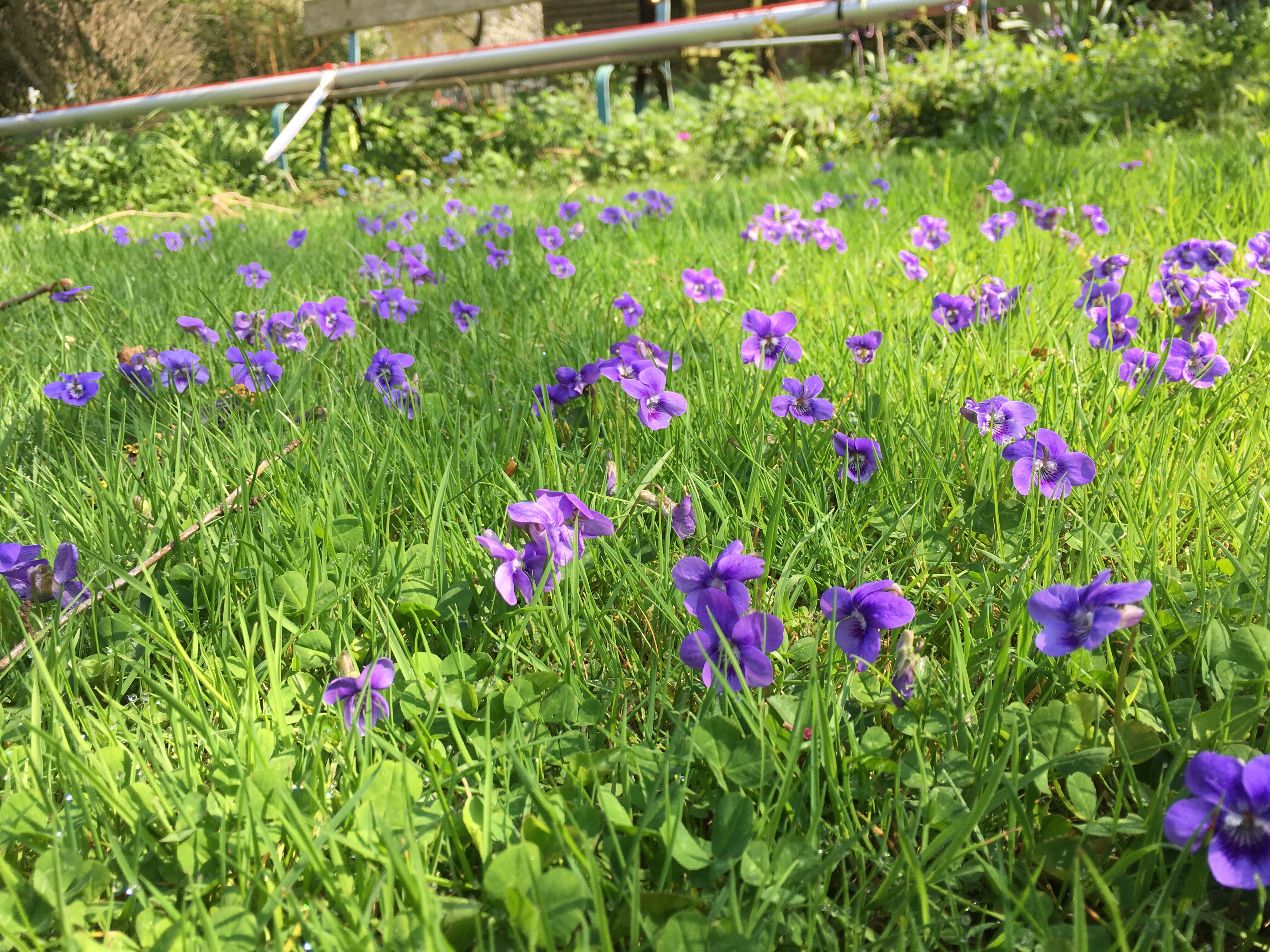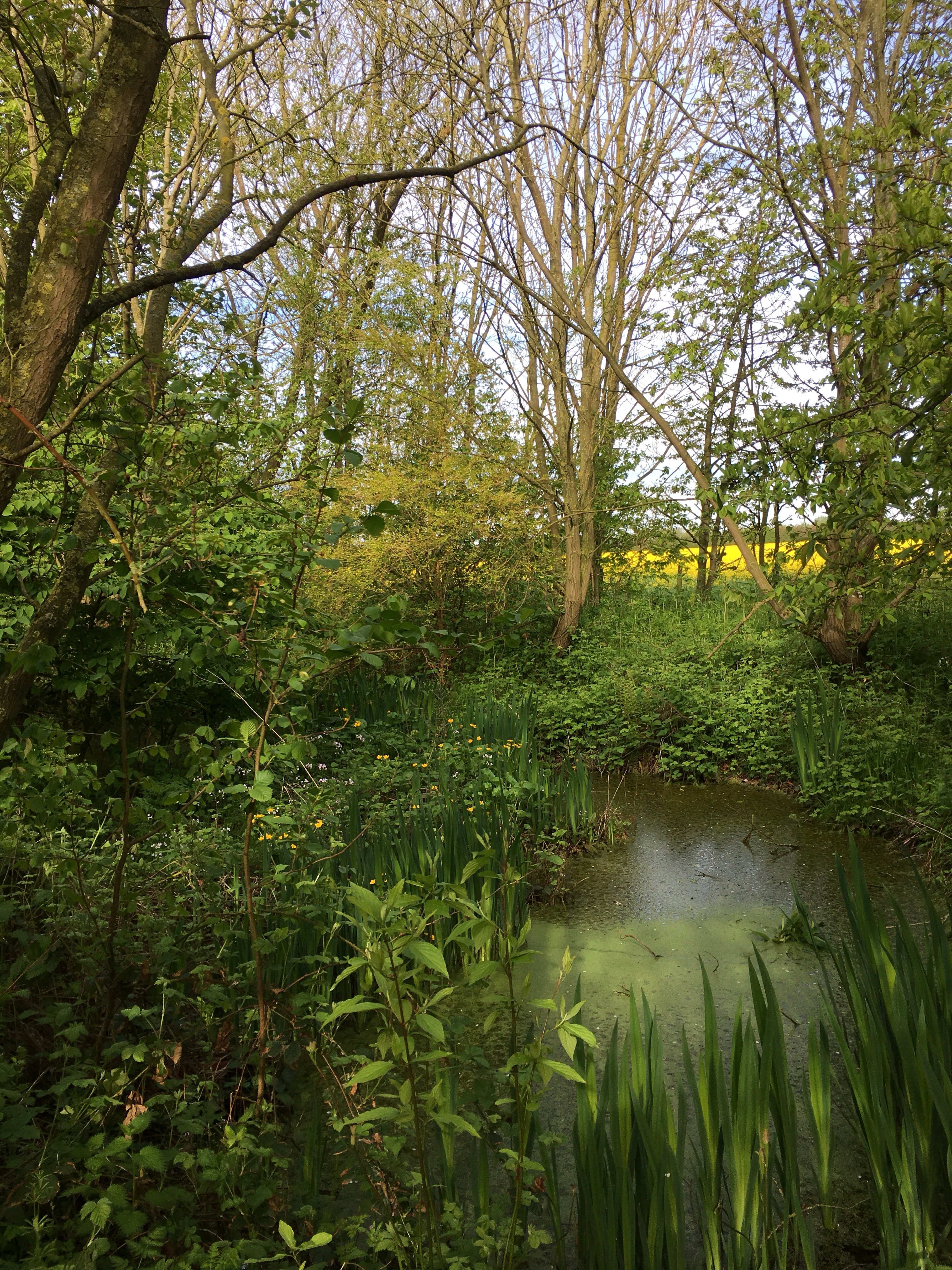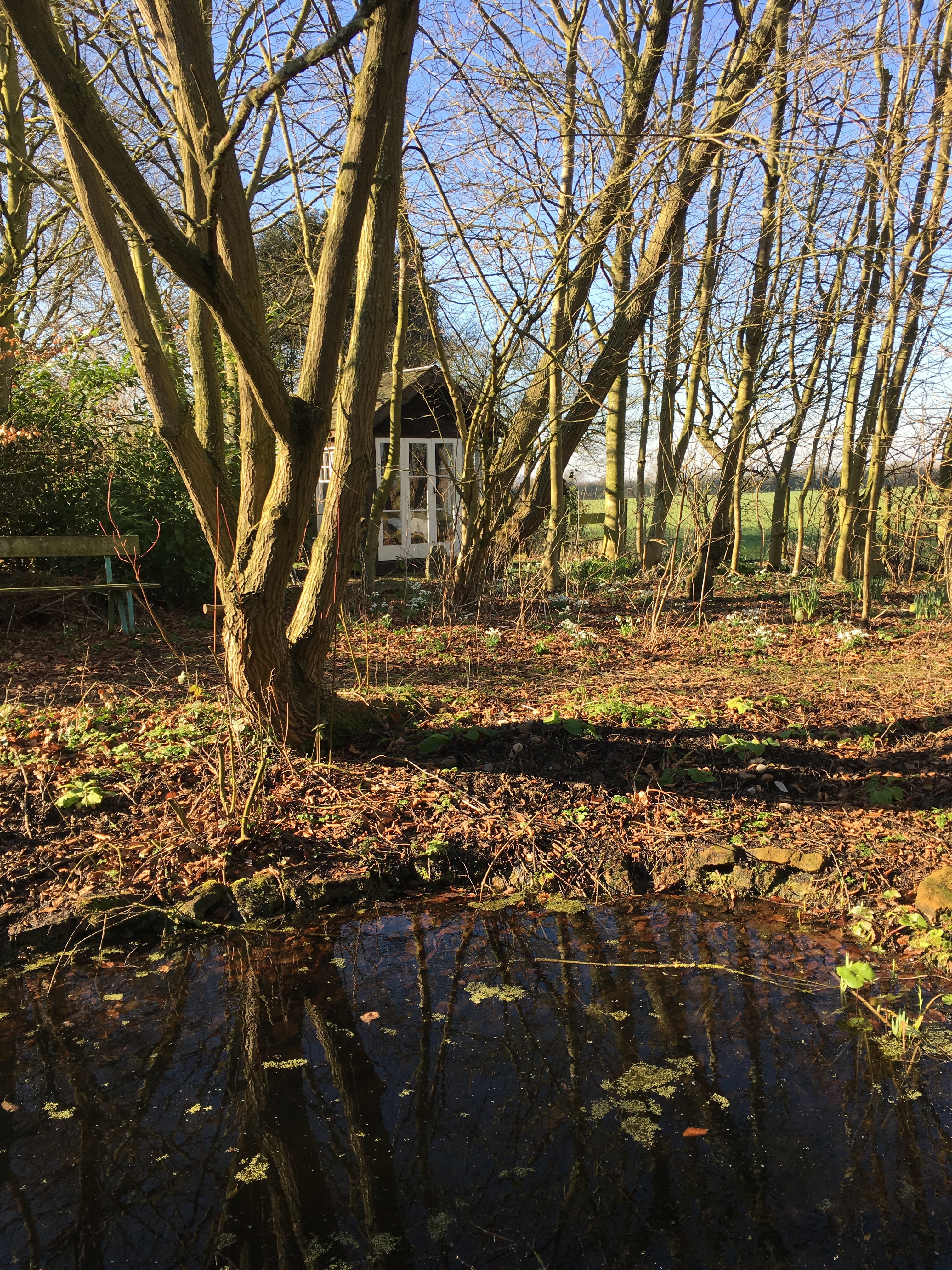 The horseshoe pond can viewed from the potting shed windows. There’s a gently-sloping boulder beach to stand on, and this gives easy access for hedgehogs, frogs, newts and grass snakes. It’s very calming to stand and watch the ripples from raindrops. Today the pond is a cauldron of frogs, mating and producing frog spawn.